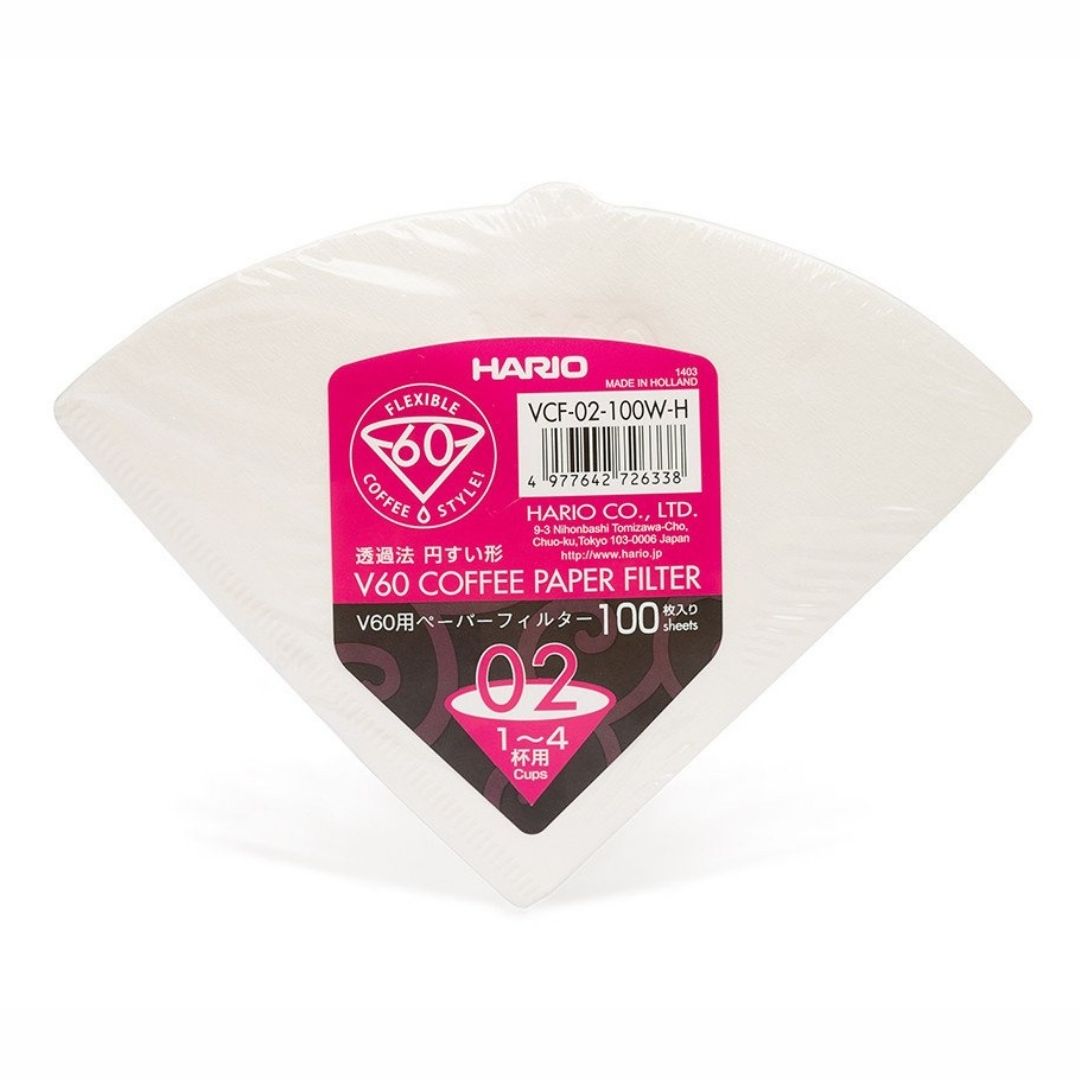 Filterpapers for drip brewing made in the EU. • Brand: Hario • Range: V60 • Material: bleached paper • Size: 02 • Dimensions: 175mm top corner to corner • Quantity: 1x100 • Lifespan: single use • Fits: all Hario V60 02 drippers • Brews: 1-4 cups • Also available: unbleached paper