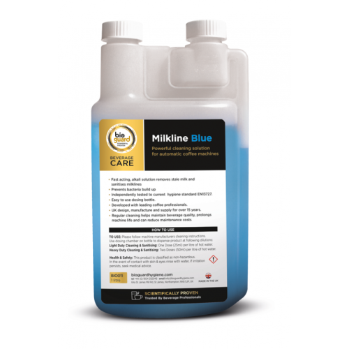 Bioguard’s Alkali formula cleans fresh milk and sanitises milk lines on automatic machines. The product should be used as part of the automatic cleaning cycle on the machine and you should mix the chemical with water in either the milk container or a jug. It should then flush through and clean the milk from the milk lines.  Formulation developed with leading coffee machine suppliers & users. Fast acting, alkali solution removed stale milk and sanitises milklines, preventing bacteria build up.  Light duty 25ml per litre of water Heavy dury 50ml per litre of water.